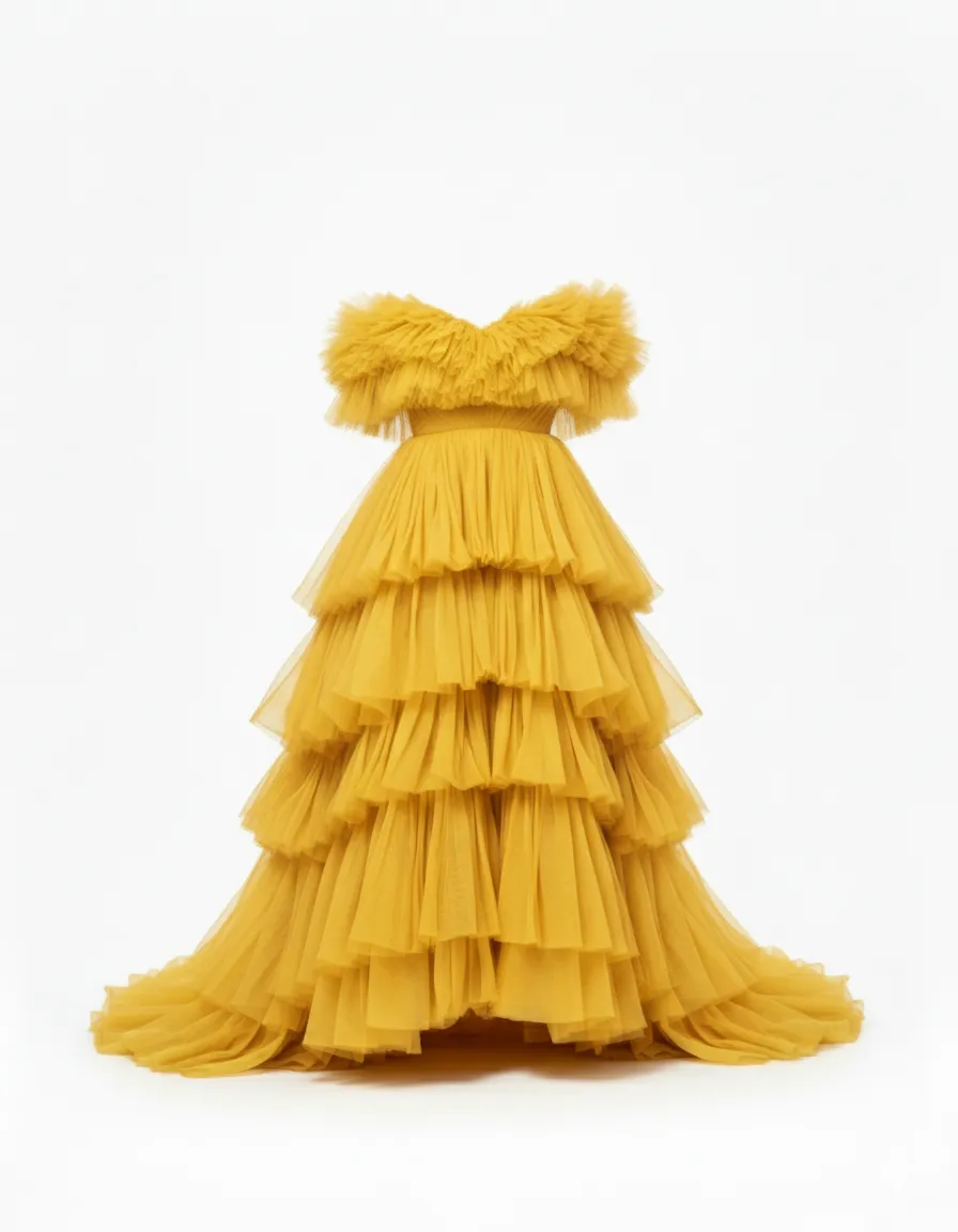Embrace couture elegance in The Aurelia Golden Tiered Tulle Off-the shoulder Gown, a radiant showpiece designed for dramatic entrances. Crafted from layers of fine tulle, this gown features a breathtaking tiered silhouette that flows gracefully to the floor. The off-shoulder neckline frames the shoulders beautifully, adding softness to its bold, voluminous shape.