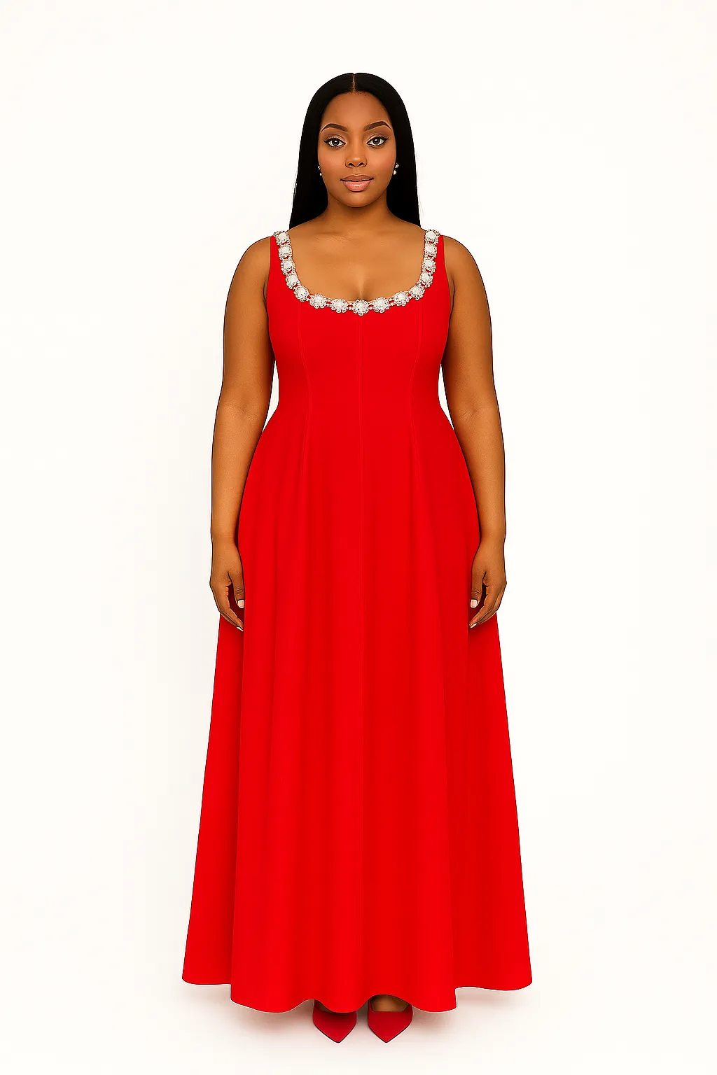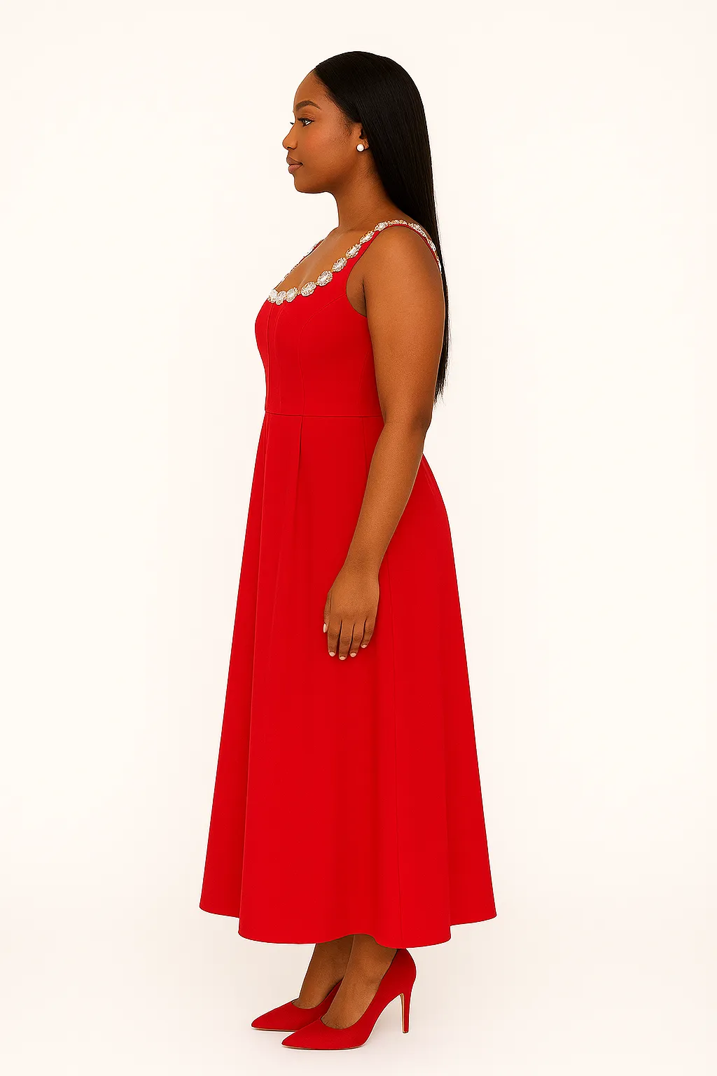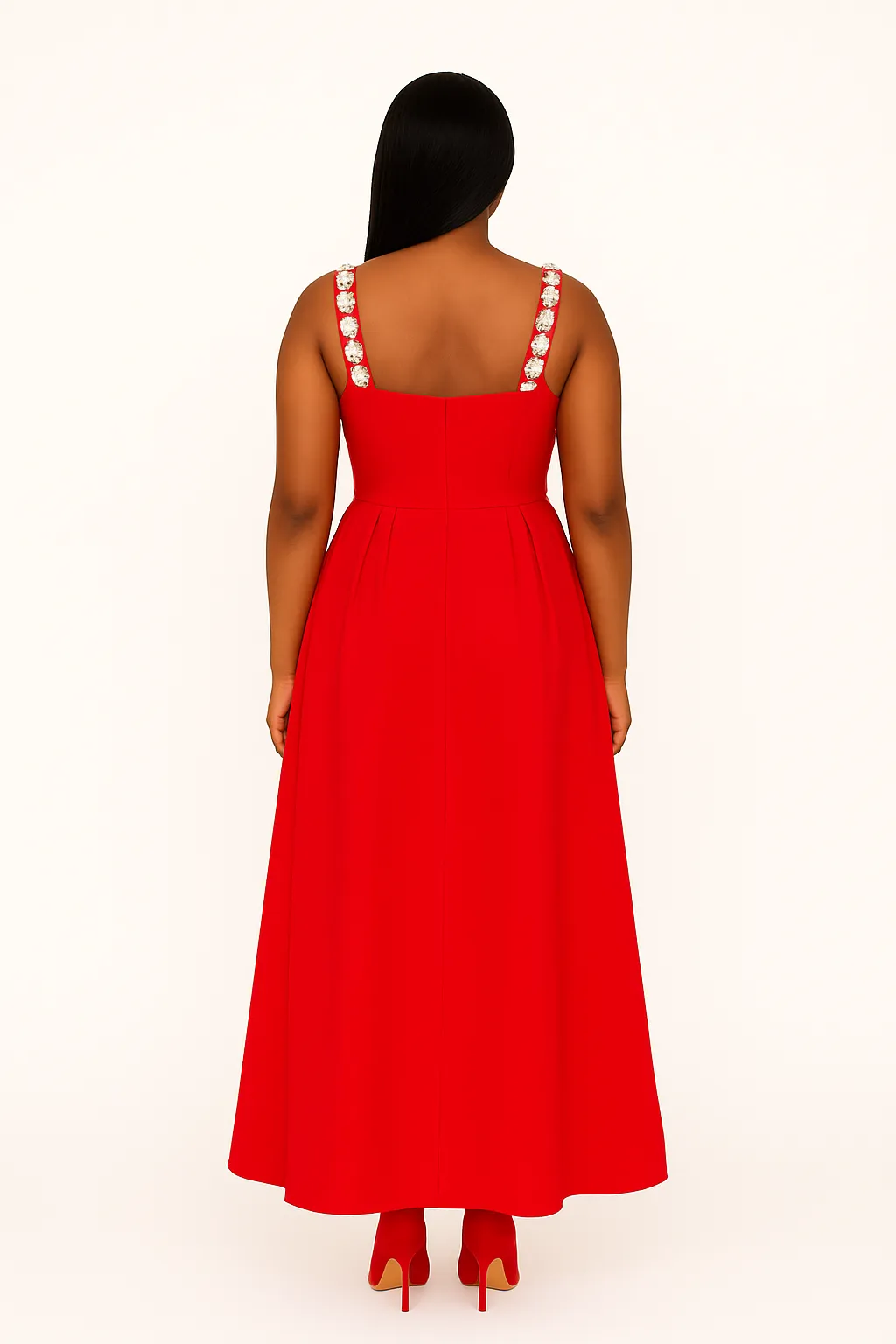Stunning scarlet ensemble featuring rich red tones and elegant design. Perfect for making a bold statement at any special occasion.