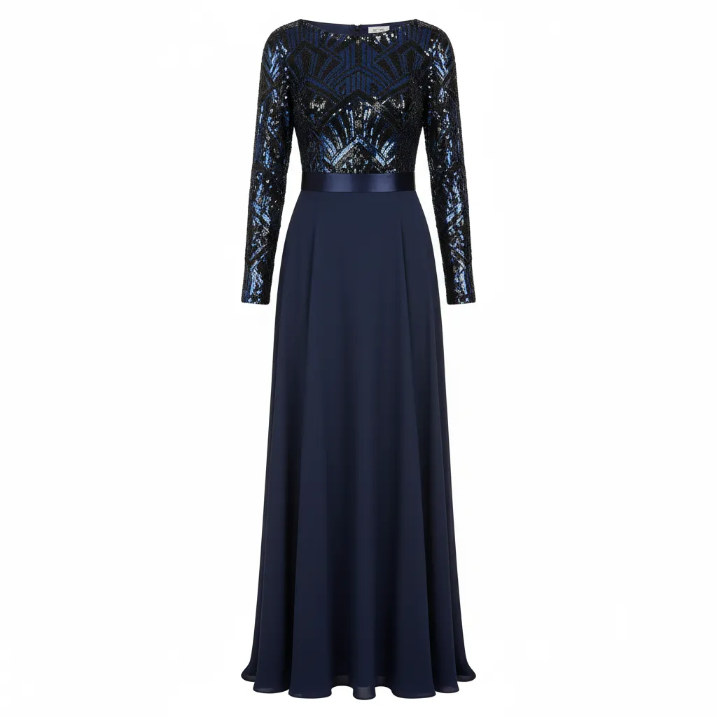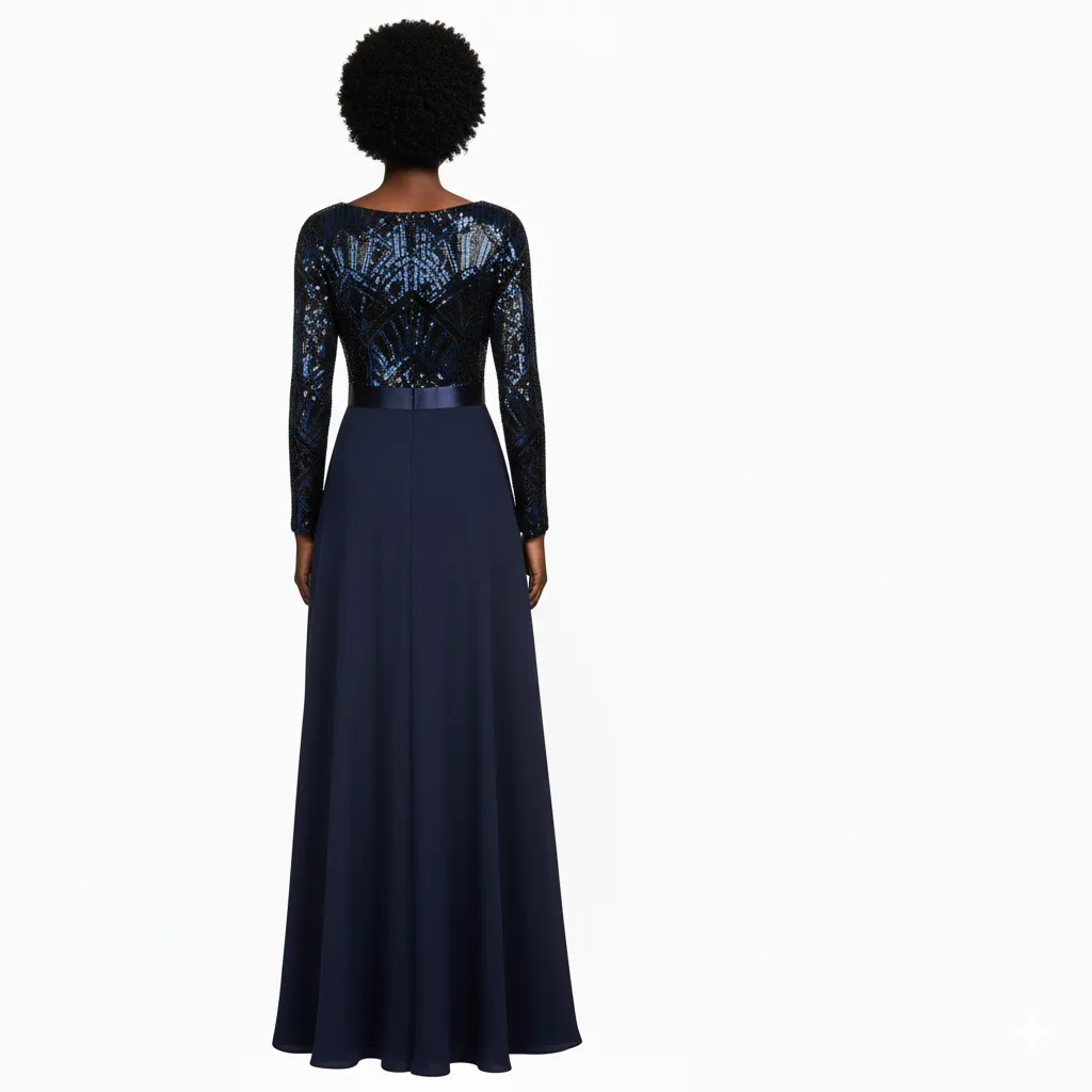 - Dazzling Sequined Bodice: The standout feature of this gown is its shimmering bodice, meticulously adorned with intricate blue and black sequins arranged in a striking geometric pattern. This glittering top catches the light beautifully, evoking the sparkle of a starry night.